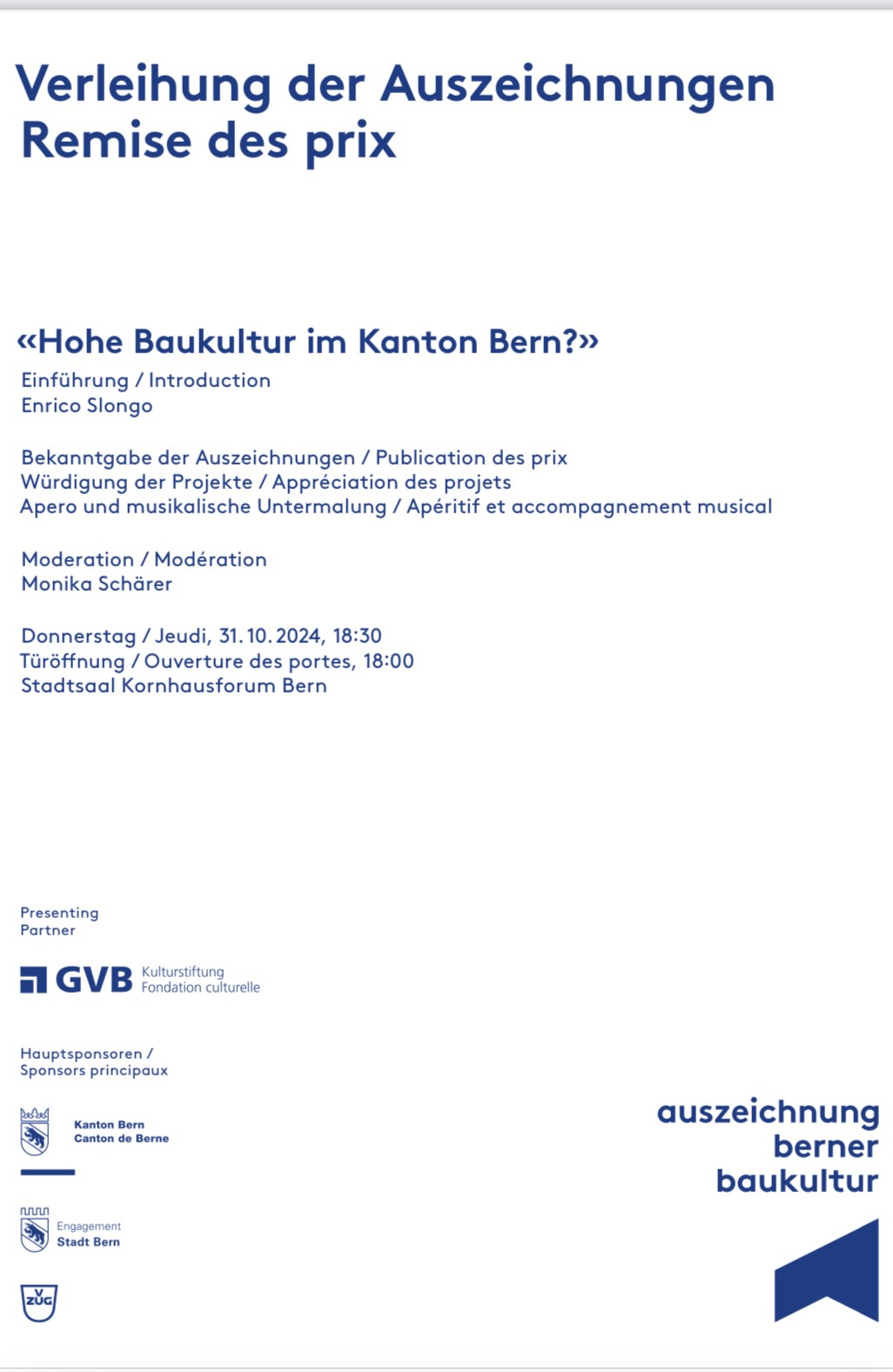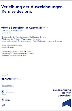 Die Auszeichnung "Hohe Baukultur im Kanton Bern" findet am 31. Oktober 2024 in Kornhausforum in Bern statt.